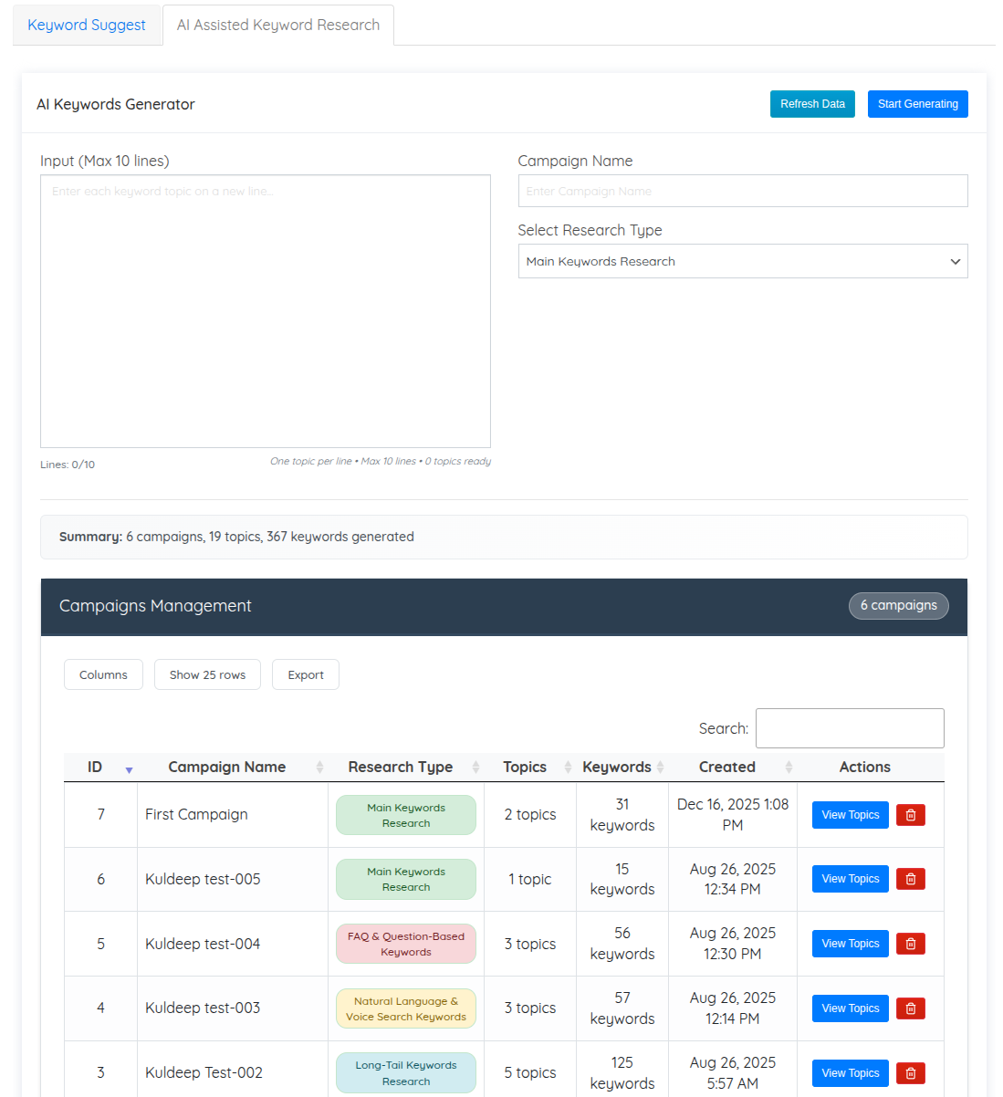 < Back Main Project Management Keyword Research AI-Assisted Keyword Research Print PostedDecember 26, 2025 UpdatedJanuary 2, 2026 ByTSDadmin The AI-Assisted Keyword Research tool uses artificial intelligence to generate comprehensive, contextually-relevant keyword lists based on your topics. Advantages over traditional generation: Understands context and semantic relationships Generates more natural, conversational keywords Better for voice search and long-tail opportunities Creates thematically grouped keywords Creating an AI Keyword Campaign Step 1: Access AI Keyword Generator Click the AI Assisted Keyword Research tab within Keyword Research. You’ll see the AI Keywords Generator interface with: Input field (maximum 10 lines) Campaign Name field Select Research Type dropdown Refresh Data and Start Generation buttons Step 2: Enter Your Topics In the Input field: Enter your main topics, one per line Maximum of 10 topics at a time Be specific but not overly narrow Example inputs: coffee brewing methods espresso machine maintenance cold brew techniques coffee bean origins coffee grinder types Important: One topic per line. The system accepts a maximum of 10 topics, which generates up to 5 research topics internally. Step 3: Name Your Campaign Enter a Campaign Name to identify this research session: Use descriptive names Include date or client name if relevant Example: “Coffee Blog Keyword Research – Jan 2025” Step 4: Select Research Type Choose from the Select Research Type dropdown: Main Keywords Research (default): Broad, primary keywords High-level topic keywords Good for pillar content FAQ & Question-Based Keywords: Question format keywords “How to”, “What is”, “Why does” patterns Perfect for FAQ content and featured snippets Natural Language & Voice Search Keywords: Conversational phrases Voice search optimized Longer, more natural phrasing Long-Tail Keywords Research: Highly specific keyword phrases Lower competition Higher conversion potential Example Selection: Choose “FAQ & Question-Based Keywords” if you’re creating an FAQ section or targeting featured snippets. Step 5: Start Generation Click the Start Generation button The AI begins processing your topics and generates keywords in the background. You’ll see a summary like: “Summary: 6 campaigns, 19 topics, 367 keywords generated” This indicates: 6 research campaigns created 19 topics covered 367 total keywords generated Campaign Management Table After generation, the Campaigns Management section displays all your research campaigns in a table: Table Columns: ID: Unique campaign identifier Campaign Name: Your assigned name Research Type: Badge showing the type (color-coded) Topics: Number of topics covered Keywords: Total keywords generated Created: Date and timestamp Actions: View Topics and Delete buttons Example entries: Campaign: “First Campaign” | Research Type: Main Keywords Research (green badge) | Topics: 2 | Keywords: 31 | Created: Dec 16, 2025 1:08 PM Campaign: “Kuldeep test-005” | Research Type: Main Keywords Research (green badge) | Topics: 1 | Keywords: 15 | Created: Aug 26, 2025 12:34 PM Campaign: “Kuldeep test-004” | Research Type: FAQ & Question-Based Keywords (red badge) | Topics: 3 | Keywords: 56 | Created: Aug 26, 2025 12:30 PM The header shows “6 campaigns” button indicating total campaigns created. Research Type Color Coding: Green badges: Main Keywords Research Red badges: FAQ & Question-Based Keywords Orange badges: Natural Language & Voice Search Keywords Blue badges: Long-Tail Keywords Research Viewing Campaign Topics and Keywords To view keywords from a campaign: Click the blue View Topics button for the desired campaign A detailed view opens showing: Each topic within the campaign Keywords generated for that topic Keyword metrics (if available) Each topic has its own keywords table with: Column visibility controls Rows display options Export functionality Search box for filtering Example workflow: Click “View Topics” on “First Campaign” See Topic 1: “coffee brewing methods” with 15 keywords See Topic 2: “espresso machine maintenance” with 16 keywords Export keywords for Topic 1 to use in subdomain creation Use the search box to find specific keyword patterns Refresh Data Button: If a campaign is still generating, use the Refresh Data button to update the display with newly generated keywords. Exporting AI-Generated Keywords For each topic within a campaign: Column visibility: Choose which data columns to display Show 25 rows: Select how many keywords to show per page Export options: Copy to clipboard Export as CSV (full table) Export keywords only (CSV) Export visible columns (CSV) Search functionality: Filter keywords containing specific terms Example: If you’ve generated FAQ keywords about coffee, you can search for “how to” to see only question keywords starting with that phrase. Deleting Research Campaigns To remove a campaign: Click the red Delete button next to the campaign Confirm deletion The campaign and all its keywords are permanently removed When to delete: Test campaigns no longer needed Duplicate research sessions Outdated keyword sets Best Practices for AI Keyword Research Be Specific with Topics Instead of broad terms, use focused topics: ❌ “marketing” ✅ “email marketing automation for ecommerce” Use Different Research Types Strategically Create multiple campaigns with different research types for the same niche: Campaign 1: Main Keywords Research (for pillar content) Campaign 2: FAQ & Question-Based (for featured snippets) Campaign 3: Long-Tail Research (for conversion pages) Batch Similar Topics Group related topics in one campaign: Coffee brewing methods, grind sizes, water temperature, brew time All related to coffee brewing education Review and Refine After generation: Review keywords for relevance Remove any off-topic suggestions Group similar keywords for content planning Use for Content Planning The