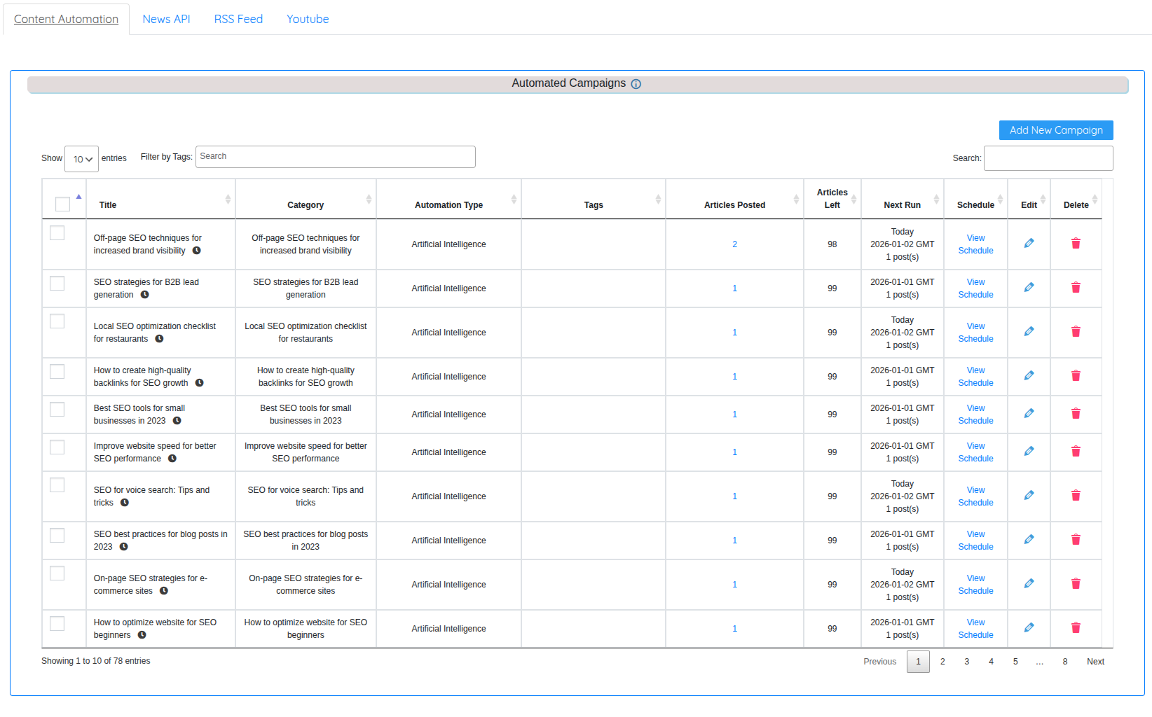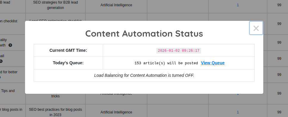 < Back Main Post Campaigns Content Automation Campaigns Print PostedDecember 26, 2025 UpdatedJanuary 2, 2026 ByTSDadmin Navigate to Post Campaigns → Content Automation to manage spintax and AI-powered content campaigns. Content Automation Dashboard Overview Panel: Displays all Content Automation campaigns in comprehensive table Shows Stream Title, Automation Type, Category, Notes, Articles Posted Edit and Delete buttons for each campaign Information icon in header shows scheduling summary Scheduling Information: Click information icon in table header Displays: “Today X articles will be published through content automation campaigns” Click “View Queue” button to see detailed schedule: Which campaigns posting today Target category/subdomain Next post date and time Number of articles scheduled Campaign status Campaign Types Visible: Based on API Settings and Feed Settings configuration: Automation Content (Spintax) – Always available Artificial Intelligence – Visible if AI enabled in Feed Settings Article Forge – Visible if enabled in API Settings and Feed Settings Kontent Machine – Visible if enabled in API Settings and Feed Settings Adding New Content Automation Campaign Click “Add New Campaign” button in top right corner to create campaign. Common Fields (All Campaign Types): Campaign Name Purpose: Internal identifier for your reference Not Displayed: Public never sees this name Best Practice: Use descriptive naming like “Dental-Chicago-AI-Q1-2024” Use For: Identifying campaign purpose Tracking performance Organizing by client, niche, or date Tag Purpose: Organize campaigns for filtering Format: Single tag or multiple Use Cases: Niche organization (all “healthcare” campaigns) Client grouping (all “client-abc” campaigns) Content type (all “evergreen” campaigns) Project phases (all “phase-1” campaigns) Stream Purpose: Select content source type Dropdown Options: Automation Content (Spintax) Artificial Intelligence Article Forge (if enabled) Kontent Machine (if enabled) Selection Changes Form: Additional fields appear based on stream type Automation Content (Spintax) Campaign When to Use: You have professionally spun content ready Want maximum control over content Specialized industry content requiring manual writing Testing specific article templates Multilingual content requiring human translation Required Fields: Post Title Purpose: Title template for all posts in campaign Format: Use spintax syntax for variation Example: {Best|Top|Leading} {Dental Implants|Tooth Replacement|Implant Surgery} in {Chicago|Illinois} Result: Each post gets unique title generated from spintax Choose File (Spintax Content) Purpose: Upload text file containing spun content Format: Standard .txt file with spintax syntax Spintax Example: {Dental implants are|Tooth implants represent|Implant dentistry is} {a popular|an effective|a proven} {solution|method|treatment} for {missing teeth|tooth loss|dental gaps}. Result: System generates unique article variations from spinning syntax After Upload: Preview Articles button appears Click to see sample generated articles Verify spinning quality before saving campaign Image or Video Search by Keyword Purpose: Find relevant images for spintax content posts Checkbox: Enable to activate keyword field Keyword Field: Enter search terms for images Source: Images fetched from Pixabay or Unsplash (configured in API Settings) Example: “dental implant, dentist office, tooth xray” Campaign Notes Purpose: Internal description for your reference Not Displayed: Public never sees notes Use For: Documenting: Campaign strategy Client requirements Content source Special instructions Performance expectations Post Status Purpose: Set WordPress status for published posts Options: Published – Posts go live immediately Draft – Saved for manual review before publishing Pending Review – Awaiting approval Default: Published (most common for automation) Category Purpose: Select destination subdomain or category Dropdown: Lists all created subdomains and categories Selection: Posts publish to this location only Strategy: Match content theme to subdomain niche Number of Posts Purpose: Total posts to create from spintax content Example: Enter “50” to generate 50 unique posts from spinning Calculation: Works with Duration to determine posting frequency Limitation: Cannot exceed unique variations possible from spintax quality Duration in Days Purpose: Spread posts across this many days Example: 50 posts over 25 days = 2 posts per day Formula: Number of Posts ÷ Duration = Posts Per Day Strategy: Longer duration appears more natural Start Date Purpose: When campaign begins posting Options: Today’s date (immediate start) Future date (scheduled start) Use Case: Coordinate multiple campaign launches Post Now Purpose: Publish first day’s posts immediately Checkbox: Enable for instant publishing Effect: When checked: First batch posts as soon as campaign saved When unchecked: Follows normal schedule starting from Start Date Use Case: Need content immediately vs. gradual rollout Saving Campaign: Click “Save Automated Post Campaign” button after completing all fields. Artificial Intelligence Campaign When to Use: Generating completely original content at scale Need fast content production Covering broad topics AI handles well Multilingual content (25+ languages) Regular content updates without manual writing Important: AI must be enabled in Feed Settings for this option to appear. Standard Fields (same as Automation Content): Campaign Name Tag Stream (select “Artificial Intelligence”) Post Status Category Number of Posts Duration in Days Start Date Post Now AI-Specific Fields: New Content Prompt Set Purpose: Select AI prompt configuration Default: “Default Set” (works for most use cases) Options: Any custom prompt sets created in AI Settings Selection Impact: Controls article structure Determines content style Affects SEO optimization approa
