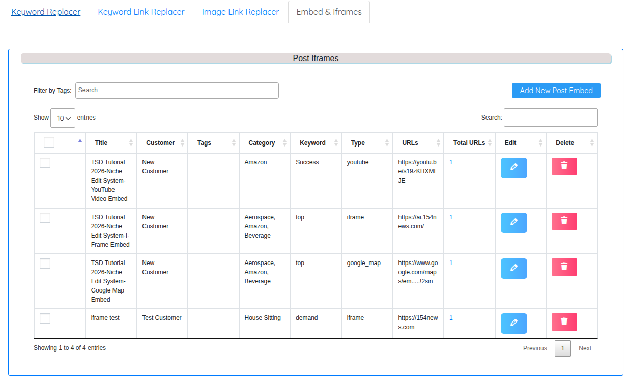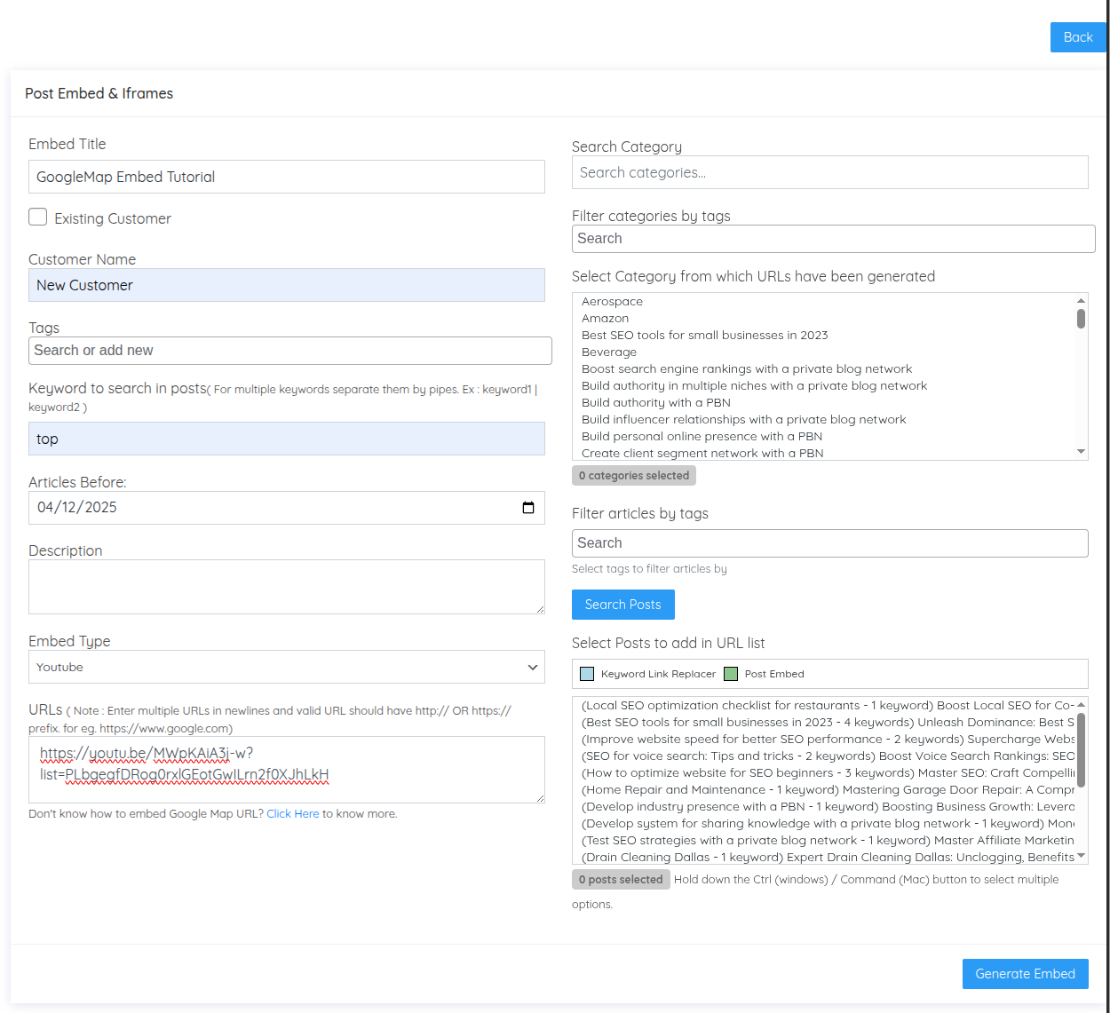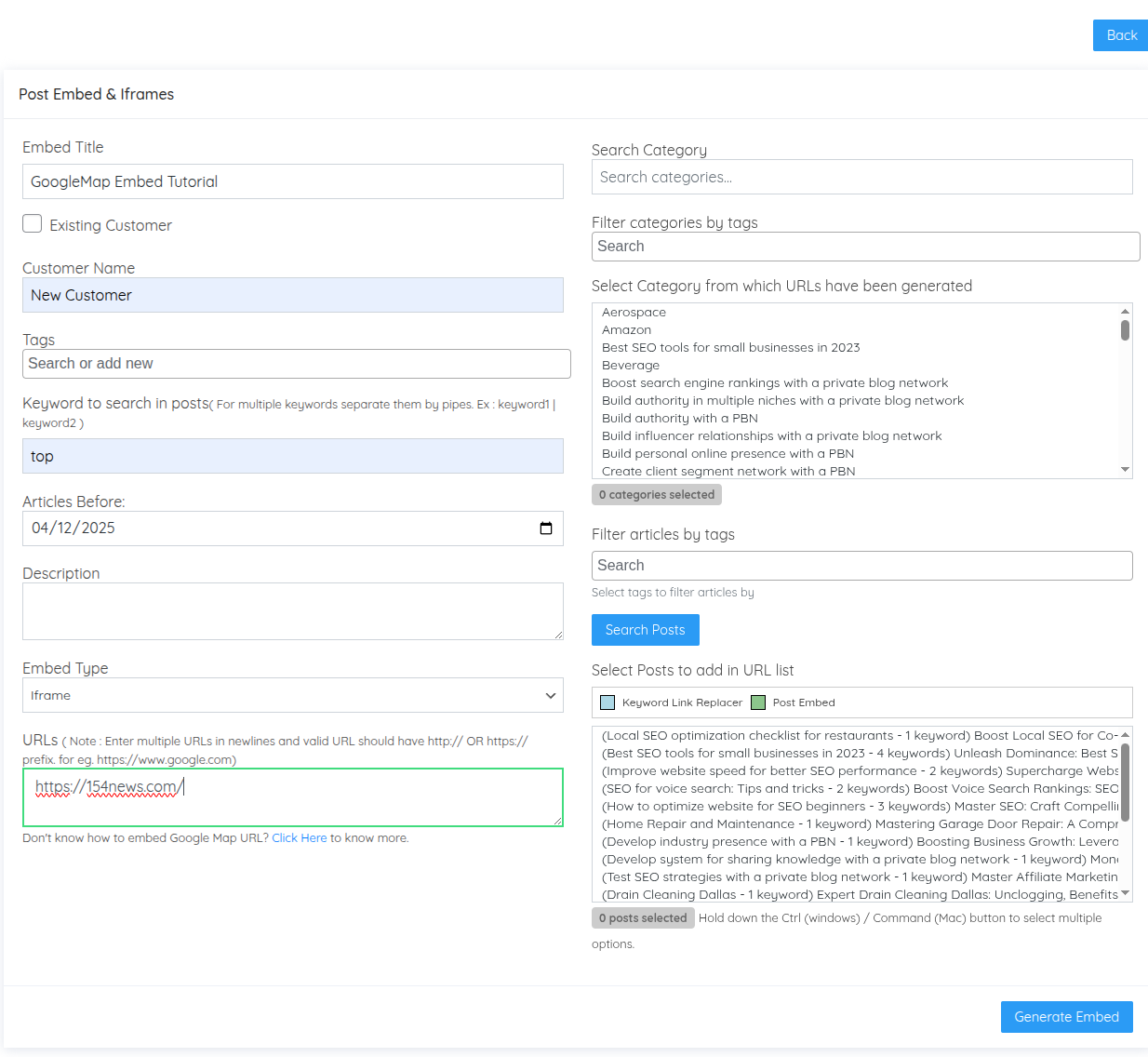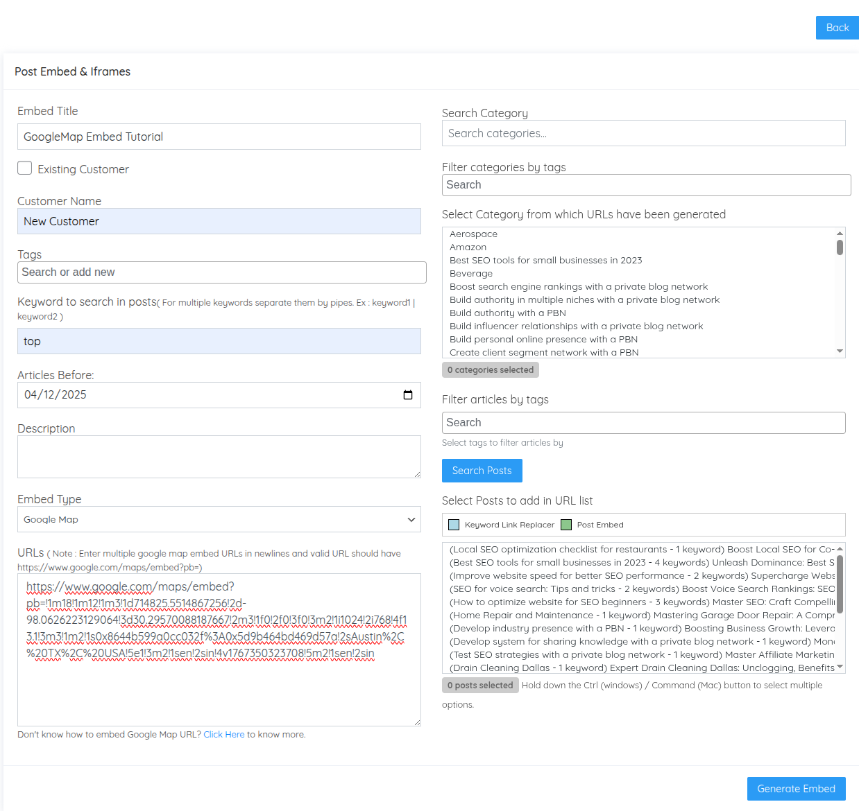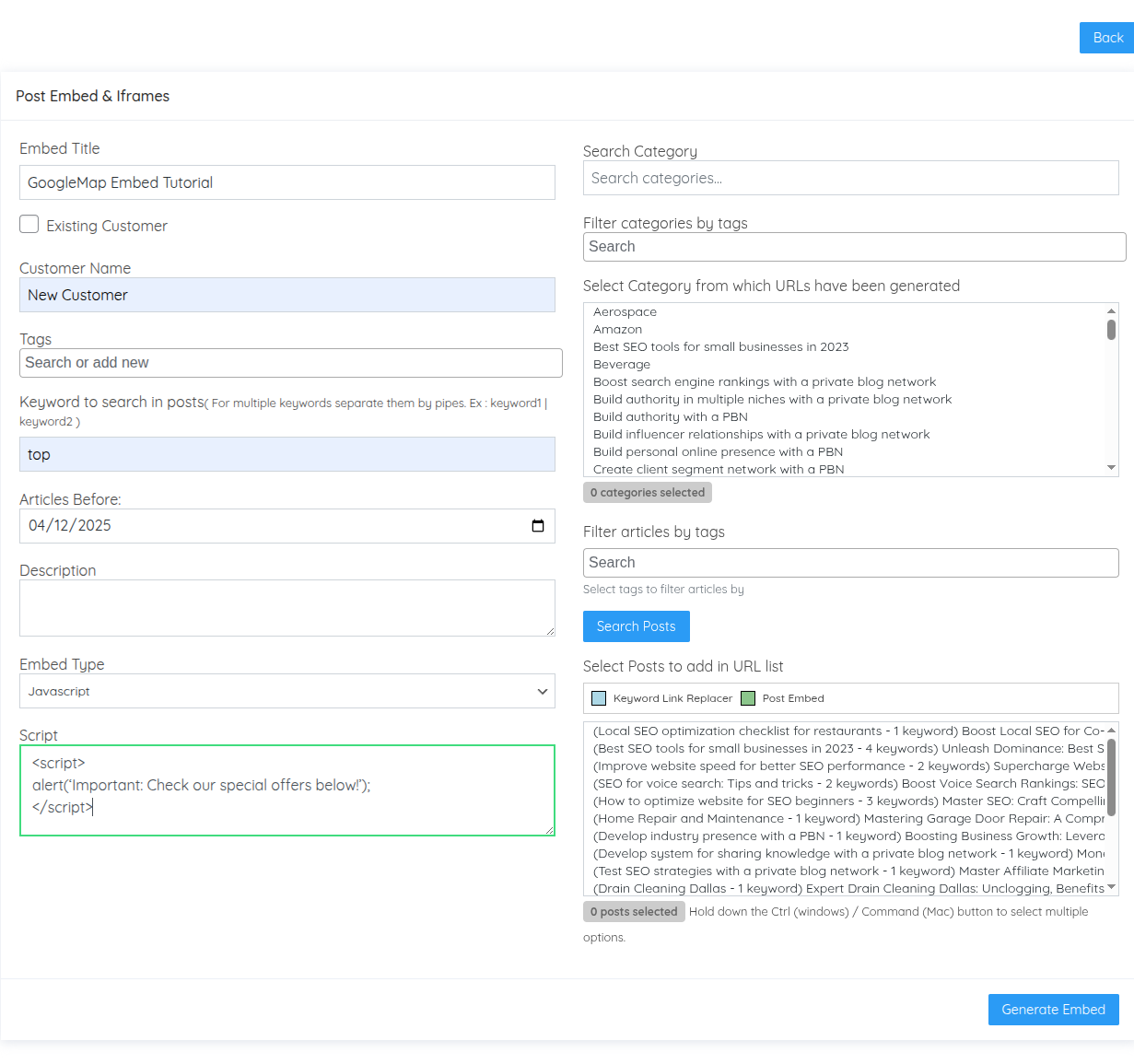 < Back Main Niche Edit System Embed & iFrames Print PostedDecember 26, 2025 UpdatedJanuary 2, 2026 ByTSDadmin Navigate to Niche Edit System → Embed & iFrames to enrich your content with embedded maps, videos, iframes, and custom JavaScript. Understanding Embeds and iFrames The Embed & iFrames system allows you to insert interactive content into articles across your private blog network. This feature enhances user engagement, provides additional value, and can improve time-on-page metrics. Four Embed Types Available: Google Maps: Embed location maps iFrames: Display external web pages within articles YouTube Videos: Embed video content JavaScript: Custom code and interactive elements How It Works: Unlike overlays that appear as popups, embeds are inserted directly into article content at the end of posts. They become permanent parts of the article, visible to all readers. Embed Campaigns Dashboard The Post Iframes dashboard displays all your embed campaigns: Campaign Name: Identifier for the embed campaign Customer Name: Client or project assignment Tags: Organizational labels Category: Where embeds are placed Keyword: Keywords used to filter articles Type: Embed type (youtube, iframe, google_map, javascript) URLs: Target URLs or script codes Total URLs: Number of embeds created Edit/Delete: Campaign management Visual Indicator: Articles that already contain embeds display with a green background in the post selection interface, helping you avoid duplicate embeds. Creating an Embed Campaign Click Add New Post Embed in the top right corner to create a new embed campaign. Campaign Configuration Fields: Embed Title Enter a descriptive name for this embed campaign. Examples: “Dental Office Location Maps” “Product Demo Videos” “Customer Testimonial Embeds” Customer Management Create a new customer or assign to existing customer: New: Uncheck “Existing Customer” and enter name Existing: Check box and select from dropdown Tags Add organizational tags: tag1|tag2|tag3 Keyword to Search Enter keywords to filter which articles should receive embeds. Only articles containing these keywords will be eligible. Format: keyword1|keyword2|keyword3 Date Filter Select “Articles Before” date to filter articles by publication date. Description Add internal notes about this embed campaign. Embed Type Select which type of content to embed from the dropdown: Google Map Iframe YouTube Videos JavaScript Let’s explore each embed type in detail. Google Maps Embeds Google Maps embeds display interactive location maps within articles, perfect for local businesses, office locations, service areas, or event venues. Select Embed Type: Choose Google Map from the dropdown. Obtaining the Google Maps Embed URL: Open Google Maps: Navigate to https://maps.google.com Search for Location: Enter the address or location name Click Share: Click the “Share” button on the location card Select Embed a Map: Click the “Embed a map” tab Copy HTML: Click “Copy HTML” button Extract URL: The copied code looks like: <iframe src=”https://www.google.com/maps/embed?pb=…” width=”600″ height=”450″></iframe> Extract Just the URL: Copy only the URL portion between the quotes after src= What to Copy: https://www.google.com/maps/embed?pb=!1m18!1m12!1m3!1d3153.0… What NOT to Copy: <iframe src=”https://www.google.com/maps/embed?pb=…” width=”600″ height=”450″></iframe> Paste in URL Field Paste the extracted URL into the URL field in Turbo Subdomains. Multiple Maps You can enter multiple Google Maps URLs (one per line) to rotate different location maps across selected articles. Example Use Case: A dental practice with multiple locations can embed different office location maps across relevant articles: https://www.google.com/maps/embed?pb=…downtown-office… https://www.google.com/maps/embed?pb=…suburbs-office… https://www.google.com/maps/embed?pb=…west-side-office… iFrame Embeds iFrames allow you to embed any external webpage directly within your articles. This could be product pages, booking systems, calculators, or any web-based tools. Select Embed Type: Choose Iframe from the dropdown. Enter Website URL Simply enter the full URL of the webpage you want to embed: Format: https://www.example.com/page Valid Examples: https://www.booking-system.com/calendar https://www.calculator-tool.com/mortgage https://www.external-site.com/resource-page Important Considerations: Some websites block iframe embedding for security reasons Test the iframe to ensure the target site allows embedding Ensure embedded content is appropriate and valuable to readers Multiple iFrames Enter multiple URLs (one per line) to rotate different iframe content across articles. Example Use Case: Embedding different product comparison tools from manufacturer websites: https://www.manufacturer-a.com/comparison-tool https://www.manufacturer-b.com/product-finder https://www.manufacturer-c.com/calculator YouTube Video Embeds YouTube embeds insert video players directly into articles, allowing readers to watch videos without leaving your site. Select Embed Type: Choose YouTube Videos from the dropdown. Enter YouTube Video URL Paste the full YouTube video URL: Format: https://www.youtube.com/watch?v=VIDEO_ID Example: https://www.youtube.com/watch?v=dQw4w9WgXcQ URL Types Supported: Standard YouTube URL: https://www.youtube.com/watch?v=VIDEO_ID Shortened URL: https://youtu.be/VIDEO_ID Embedded URL: https://www.youtube.com/embed/VIDEO_ID All formats work—Turbo Subdomains automatically extracts the video ID and creates the proper embed code. Multiple Videos Enter multiple YouTube URLs (one per line) to rotate different videos across articles. Example Use Case: Educational content with multiple tutorial videos: https://www.youtube.com/watch?v=tutorial-video-1 https://www.youtube.com/watch?v=tutorial-video-2 https://www.youtube.com/watch?v=tutorial-video-3 Different articles receive different tutorial videos, providing varie