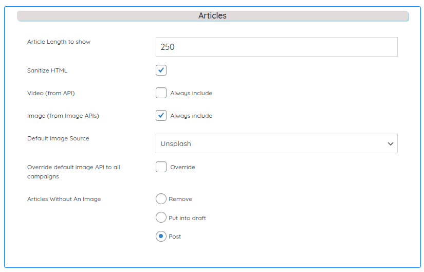 < Back Main Settings General Configuration Feed Settings Print PostedDecember 26, 2025 UpdatedJanuary 2, 2026 ByTSDadmin Navigate to Settings → Feed Settings to configure how Turbo Subdomains handles content feeds, articles, and post-related options. General Feed Settings Enable Strict SSL Check Purpose: Ensures secure encrypted connections when calling external APIs Recommendation: Keep enabled for security When to disable: Only if experiencing SSL certificate issues with specific APIs Enable Request Through Proxy Purpose: Route API requests through proxy servers for anonymity and distribution Configuration: When enabled, an input box appears for proxy list Format: Proxy URL or IP:Port:Username:Password (one per line) Use Cases: Distribute API requests across multiple IPs Maintain anonymity for scraping activities Bypass rate limiting on certain services Article Settings Article Length to Show Purpose: Define the number of words displayed in each post Default: 250 words (recommended minimum) Customization: Enter any number based on your content strategy SEO Consideration: Longer articles (500+ words) typically perform better in search rankings Sanitize HTML Purpose: Remove unwanted code from content fetched via News API or RSS feeds Function: Strips malicious scripts, unnecessary formatting, and broken HTML Recommendation: Keep enabled (checked) for all campaigns Benefit: Ensures clean, properly formatted articles without security risks Video (from API) Purpose: Include videos in articles when available from content sources Options: Check to include videos, uncheck to exclude Impact: Videos from RSS feeds or APIs will be embedded in posts if enabled Image Management Settings Always Include Image Purpose: Enforce that every post must have a featured image When Enabled: Articles without images are handled according to “Articles Without An Image” setting When Disabled: Posts can publish without images regardless of availability Articles Without An Image This setting determines what happens when image APIs fail to find or generate suitable images. Three options available: Remove Article will not be published at all Use when: Image is absolutely critical to your content strategy Drawback: May result in lower post counts Draft Article saved as draft for manual review Use when: You want to manually add images later Workflow: Review drafts periodically and add images before publishing Post Without Image Article publishes even without image Use when: Content is more important than imagery Risk: May reduce engagement and SEO effectiveness Important Logic: If “Always Include Image” is unchecked, this setting is ignored and articles post regardless of image availability. Default Image Source Purpose: Select primary image provider for all articles Available Options: Pixabay (default, with Unsplash as automatic backup) Unsplash DALL-E 3 (requires OpenAI API key in API Settings) Runware (requires Runware API key in API Settings) Fallback System: If Pixabay fails, Unsplash activates automatically Recommendation: Start with Pixabay unless you need unique AI-generated images Post Settings Spinner Purpose: Enable/disable the Spinner Settings tab in dashboard Effect: When checked: Spinner Settings tab appears in dashboard menu When unchecked: Spinner functionality disabled, tab hidden Requirement: Must be enabled to use Spin Rewriter, Word AI, or Turbo Spinner AI Purpose: Enable artificial intelligence for content creation Effect: When checked: AI Settings tab appears, AI content generation works When unchecked: AI functionality completely disabled Critical: Must be enabled if using any AI-powered campaigns Article Forge and Kontent Machine Purpose: Enable these content sources in Content Automation campaigns Effect: When checked, Article Forge and Kontent Machine appear as selectable sources in campaigns Requirement: API keys must be configured in API Settings Without API Keys: Even if checked, sources won’t work without valid API credentials Do Not Duplicate Purpose: Prevent duplicate posts from being created Function: Validates article titles and content against existing posts Benefit: Maintains unique content across your network Recommendation: Keep enabled to avoid content duplication issues Comments on New Posts Purpose: Allow public comments on newly published posts Important Note: Only affects new posts created after enabling Individual post settings override this global setting SEO Consideration: Comments can increase engagement signals Enable Google Translate Purpose: Enable translation functionality for new posts Use Case: Multi-language content strategy Requirement: Google Translate API must be configured in API Settings Capture Full Article Purpose: Fetch complete article content from sources instead of excerpts When Checked: Full article text retrieved and posted When Unchecked: Only summaries or excerpts used Recommendation: Enable for comprehensive content Attribute Content to Original Source Purpose: Add original source URL at the end of each post Effect: Displays “Source: [Original URL]” in post content Turbo Subdomains Recommendation: Keep disabled Reason: Since you’re posting spun/rewritten content from RSS and News API, attributing may negatively impact SEO by indicating derivative content Subdomain 404 Function Purpose: Enable orphan page redirection for broken links How It Works: If subdomain page unavailable → redirects to subdomain homepage If entire subdomain unavailable → redirects to main domain homepage Benefit: Prevents dead links, improves user experience SEO Impact: Maintains link equity, reduces bounce rate Log Settings Image Logs Purpose: Track all images used in posts Default: Enabled Location: View at Turbo Subdomains → Logs → Image Logs Use Case: Audit image sources, troubleshoot image issues Post Logs Purpose: Track post creation from campaigns (excluding Content Automation) Default: Enabled Location: View at Turbo Subdomains → Logs → Post