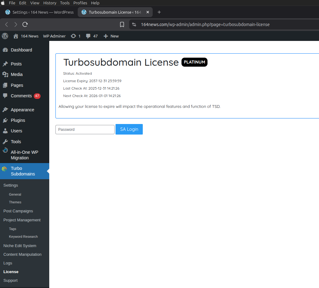< Back Main License Management Print PostedDecember 28, 2025 UpdatedJanuary 2, 2026 ByTSDadmin License Management controls your access to Turbo Subdomains features, determines your subdomain limits, and manages license activation, renewal, and expiration. Understanding your license tier and status is essential for planning your subdomain network and ensuring uninterrupted service. Understanding License Status Your license determines the capabilities and limits of your Turbo Subdomains installation. Accessing License Information Navigate to TurboSubdomains → License to view your complete license details. License Tier: Platinum License Status: ACTIVE Activation Date: When license was first activated Expiration Date: When current license period ends Days Remaining: Countdown to expiration Renewal Date: When license will auto-renew (if applicable) License Tiers and Limits Turbo Subdomains offers four license tiers: Starter License: Subdomain Limit: 100 subdomains Use Case: Small networks, testing, single projects Best For: Individual freelancers, small agencies, single-niche sites Silver License: Subdomain Limit: 250 subdomains Use Case: Growing networks, multiple projects Best For: Growing agencies, multi-niche operations, medium networks Gold License: Subdomain Limit: 500 subdomains Use Case: Large networks, multiple clients Best For: Established agencies, large PBNs, extensive networks Platinum License: Subdomain Limit: 1,000 subdomains Use Case: Enterprise-scale networks Best For: Large agencies, massive PBNs, enterprise operations Important Notes: All license tiers access identical features Only subdomain limit differs between tiers Licenses are single-site only (one WordPress installation per license) No limit on posts per subdomain No limit on campaigns or content generation What Happens When License Expires Immediate Effects: Subdomains Convert to Categories All subdomains automatically revert to standard WordPress categories. Before Expiration: https://dental-implants.yourdomain.com → Subdomain https://cosmetic-dentistry.yourdomain.com → Subdomain After Expiration: https://yourdomain.com/category/dental-implants → Category https://yourdomain.com/category/cosmetic-dentistry → Category Important: Content is NOT deleted. All posts remain accessible via category URLs. Content Generation Disabled Post campaigns stop running No new AI content generated Scheduled posts do not publish RSS/News API imports cease YouTube campaign imports halt Niche Edit System Disabled Keyword replacement stops No new backlinks created Existing backlinks remain in content (not removed) Content Manipulation Disabled Overlays stop displaying Static blocks removed from new posts (existing remain) Header/footer placements stop displaying URL redirects cease functioning Project Management Limited Cannot add new customers Cannot generate new backlink reports Existing reports remain viewable Keyword research disabled What Remains Functional: All existing content remains published All posts remain accessible (as categories) Existing backlinks in content remain Static blocks in existing posts remain Settings remain configured Campaign configurations saved License Transfer Process License transfer is required when moving Turbo Subdomains to a different domain or WordPress installation. When License Transfer is Needed Common Scenarios: Moving site to new domain name Rebuilding WordPress installation on same domain License Transfer Limitations Single-Site License: Each license activates on ONE WordPress installation Cannot run simultaneously on multiple sites Must deactivate on old site before activating on new site Transfer Process Required: Create a support ticket here- https://www.turboware.net/members/helpdesk Contacting License Support TurboWare Support Channels: Help Desk (Recommended for license issues): Submit ticket via TurboWare aMember account here-https://www.turboware.net/members/helpdesk Include TSD domain in ticket Attach screenshots if relevant Response time: Within 24 hours Facebook Group: Community support Share experiences Quick questions Not for sensitive license information Email Support: Direct email to TurboWare support Include all relevant details Good for account-specific issues