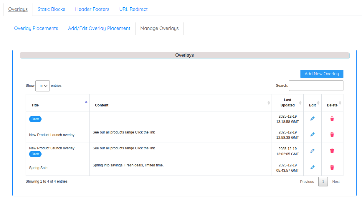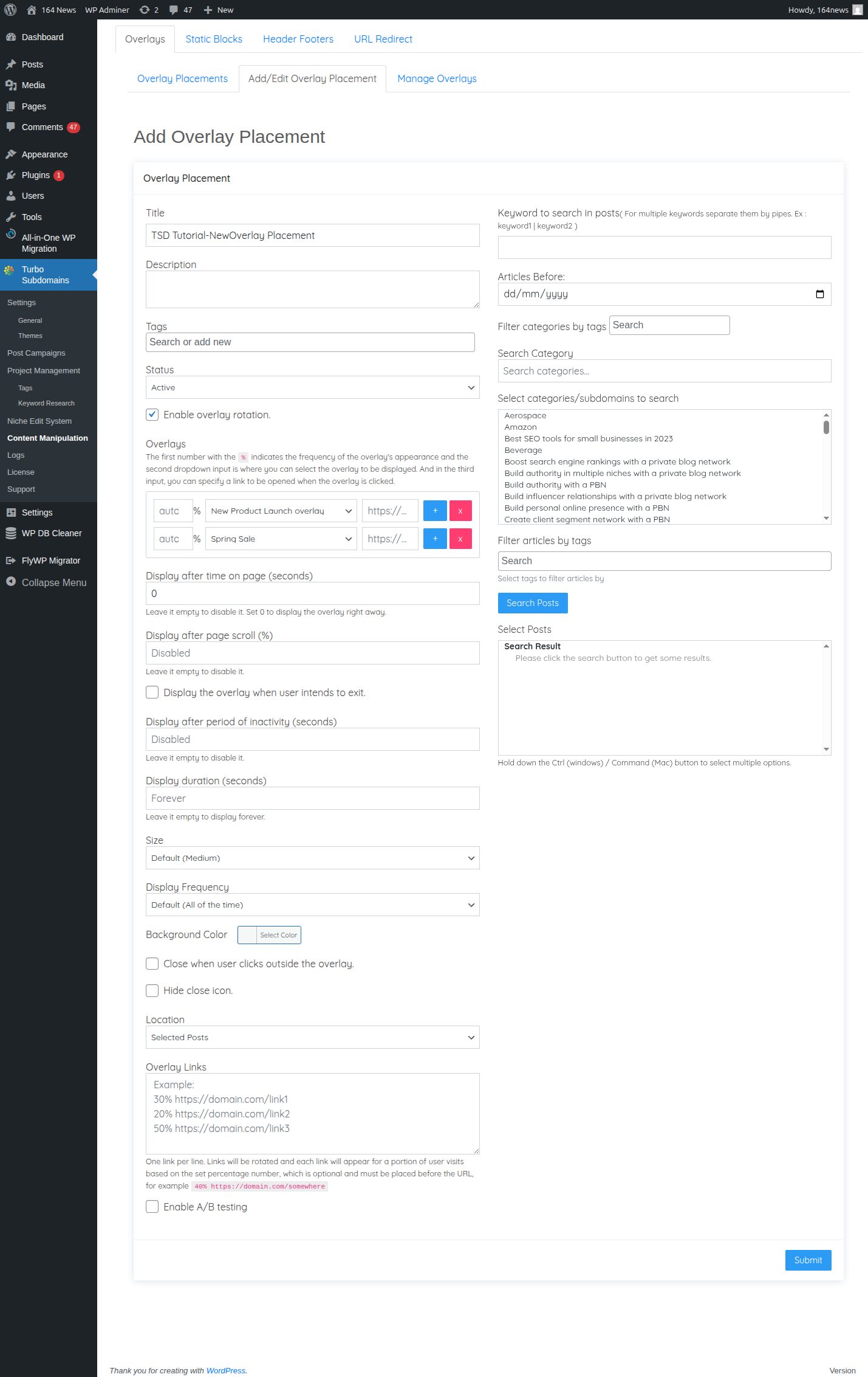 < Back Main Content Manipulation System Overlays Print PostedDecember 26, 2025 UpdatedJanuary 2, 2026 ByTSDadmin Navigate to Content Manipulation → Overlays to create and manage popup displays. Understanding Overlays Overlays are popup displays that appear on your pages based on user behavior triggers like time on page, scroll depth, exit intent, or inactivity. They’re effective for: Capturing attention with special offers Displaying important announcements Promoting new products or services Building email lists Highlighting urgent messages Three Main Components: Manage Overlays: Create and edit overlay content Add/Edit Overlay Placement: Configure when and where overlays display Overlay Placements Dashboard: Manage all overlay placements Creating Overlay Content Before you can display overlays, you must create the content that will appear in the popups. Navigate to the Manage Overlays tab and click Add New Overlay. Add Title Enter a title for this overlay. This is for your internal identification—it doesn’t appear in the popup itself. Examples: “Spring Sale 2025 Promotion” “New Product Launch Announcement” “Email Subscription Offer” Content Editor Add the content that will appear in the overlay popup. You can use the WordPress editor to: Format text (bold, italic, headings) Add images Include hyperlinks Create lists Embed HTML if needed Content Best Practices: Keep message concise and scannable Use clear, compelling headlines Include a strong call-to-action Add images for visual interest Ensure links work correctly Example Content: 🎉 SPRING SALE – 20% OFF ALL SERVICES! 🎉 Limited time offer: Get 20% off all dental services this month. ✓ Teeth Whitening ✓ Dental Implants ✓ Cosmetic Dentistry Click here to book your appointment now! [Book Appointment Button/Link] Publish Click the Publish button to save your overlay content. The overlay now appears in the Manage Overlays dashboard where you can: Edit: Modify overlay content anytime Delete: Remove overlays you no longer need You can create multiple overlays and reuse them across different placements and subdomains. Creating Overlay Placements Overlay content alone doesn’t display on your site—you must create an Overlay Placement that defines when, where, and how the overlay appears. Navigate to the Add/Edit Overlay Placement tab or click Add New Placement from the dashboard. Title Enter a descriptive title for this placement configuration. Examples: “Homepage Exit Intent Popup” “Blog Post 10-Second Delay Overlay” “Service Pages Scroll-Triggered Offer” Description Add internal notes about this placement’s purpose and strategy. Tags Assign organizational tags: tag1|tag2|tag3 Status Set the placement status: Inactive: Placement is saved but won’t display overlays (default for new placements) Active: Placement is live and displays overlays to visitors Recommendation: Create and configure placements as “Inactive,” test them, then switch to “Active” when ready for deployment. Overlay Rotation Rotation allows you to display multiple overlays randomly from a single placement. This is perfect for A/B testing different messages or showing variety to returning visitors. Enable Overlay Rotation Check this box to enable rotation and display the rotation configuration options. Adding Overlays to Rotation When rotation is enabled: Select Overlay: Choose an overlay from the dropdown (these are overlays you created in “Manage Overlays”) Set Display Percentage: Enter the percentage of time this overlay should display (e.g., 20 for 20%) Optional Landing URL: Enter a specific URL that overrides links in the overlay content Leave blank to use links within the overlay content itself Enter a URL to force all clicks to go to that destination Add More Overlays: Click the + (plus) button to add additional overlays to the rotation Rotation Example: Overlay A (“Spring Sale”): 20% display frequency, landing URL: https://www.example.com/spring-sale Overlay B (“New Product Launch”): 80% display frequency, landing URL: https://www.example.com/new-product Result: When a visitor triggers the overlay: 20% of the time they see “Spring Sale” 80% of the time they see “New Product Launch” All clicks redirect to respective landing URLs Disable Rotation Uncheck “Enable overlay rotation” to use a single overlay without rotation. When disabled: Select Overlay: Choose one overlay from dropdown This overlay displays 100% of the time when triggered Display Triggers Display triggers determine when overlays appear based on user behavior. You can combine multiple triggers—any one trigger will cause the overlay to display. Display After Time on Page Enter time in seconds. The overlay displays after the visitor has been on the page for this duration. Examples: 0 or leave blank: Display immediately when page loads 5: Display after 5 seconds 10: Display after 10 seconds 30: Display after 30 seconds Use Cases: Immediate (0): Urgent announcements, breaking news Short delay (3-5 seconds): General promotions, offers Medium delay (10-15 seconds): Engaged visitors, longer sales pitches Long delay (30+ seconds): Highly engaged visitors, premium offers Display After Page Scroll Enter a percentage (0-100). The overlay displays when the visitor scrolls to that percentage of the page. Examples: 20: Display after scrolling 20% of page 50: Display at halfway point 75: Display after scrolling 75% of page Use Cases: Early scroll (20-30%): Capture attention while reader is engaged Mid-scroll (40-60%): Reader is invested in content Late scroll (75-90%): Reader has consumed most content, ready for action Important Note: Scroll triggers work best on longer articles. On short pages with minimal content, scroll percentages are reached almost immediately. Display Overlay When User Intends to Exit Check this box to trigger the overlay when the user moves their mouse toward the browser’s top edge (indicating they’re about to 
