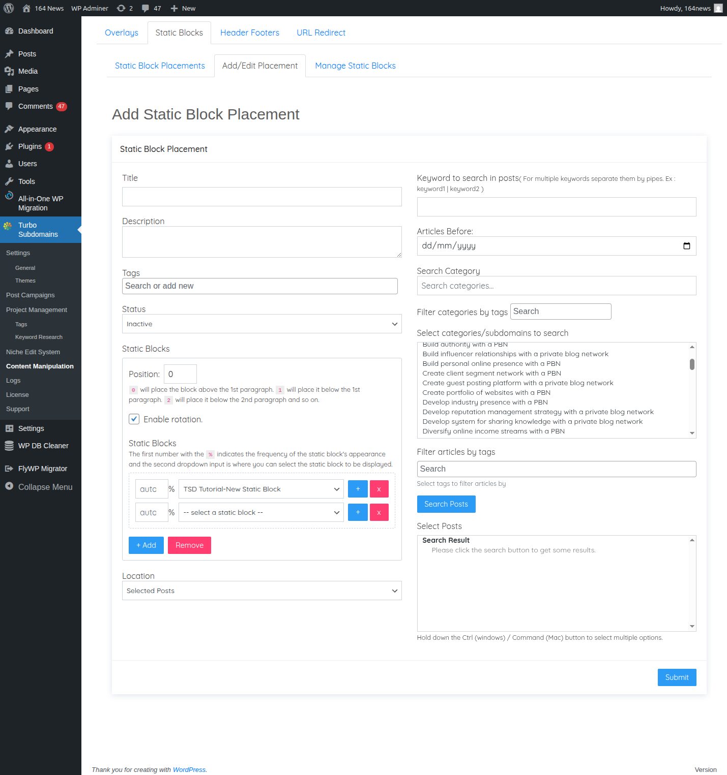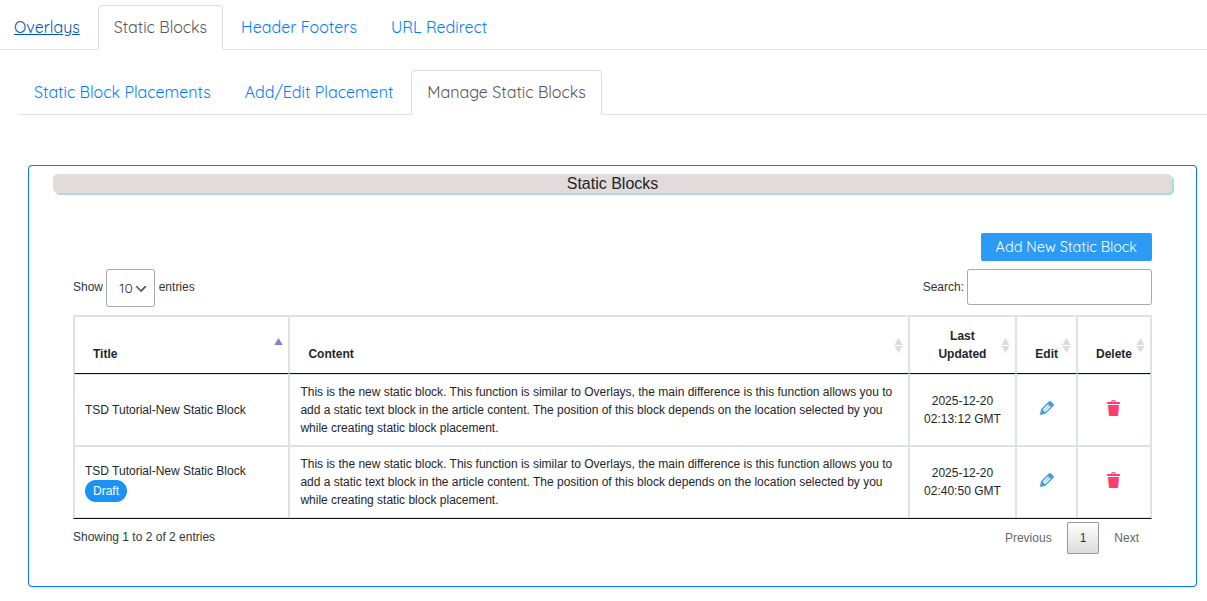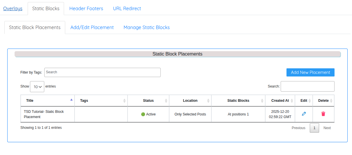 < Back Main Content Manipulation System Static Blocks Print PostedDecember 26, 2025 UpdatedJanuary 2, 2026 ByTSDadmin Static blocks function similarly to overlays but with one crucial difference: instead of displaying as popups, static blocks insert text or content directly into your article content. The position where the block appears depends on the location settings you configure when creating the static block placement. Key Difference from Overlays: Overlays: Appear as popups on top of content Static Blocks: Inserted within the article content flow Understanding Static Blocks Purpose: Inject content directly into articles at specific positions, such as calls-to-action, disclaimer text, promotional content, or informational boxes. Common Use Cases: Adding affiliate disclaimers at specific positions Inserting calls-to-action mid-article Placing promotional content between sections Adding related product information Including author bio boxes Inserting newsletter signup forms within content How Static Blocks Work: Create the block content (your text/HTML) Create a placement defining where and how it appears The system automatically inserts the block into matching articles Navigate to Content Manipulation → Static Blocks to access static block management. The Static Block System Structure The Static Block system has three main sections: Static Block Placements Tab: Configure where and how blocks appear 2. Add/Edit Placement Tab: Create or modify placement rules 3. Manage Static Blocks Tab: Create and store block content library Creating Static Block Content Step 1: Navigate to Manage Static Blocks Click the Manage Static Blocks tab within the Static Blocks section. Step 2: Create New Static Block Click the Add New Static Block button. A new editor tab opens with two main fields: Title Field: Enter a descriptive title for internal identification This title only appears in the Manage Static Blocks list Example: “Affiliate Disclaimer,” “Mid-Article CTA,” “Product Recommendation Box” Content Editor: Add your static block content using the visual editor or HTML Full WordPress editor with formatting toolbar Support for text, links, images, HTML Can include shortcodes if needed Example Static Block – Affiliate Disclaimer: Title: Affiliate Disclaimer Content: ⚠️ Disclosure: This post contains affiliate links. If you click through and make a purchase, we may earn a commission at no additional cost to you. We only recommend products we personally use and believe will add value to our readers. Example Static Block – Newsletter CTA: Title: Newsletter Signup Mid-Article Content: 📧 Love this content? Get expert tips delivered straight to your inbox! Subscribe to our weekly newsletter for exclusive insights, how-to guides, and industry updates. [Subscribe Button/Link] Step 3: Publish the Block Click the Publish button to save your static block. The block now appears in the Manage Static Blocks dashboard, showing: Block title Content preview (first few lines) Last updated date Edit and Delete options Example from screenshot: “TSD Tutorial-New Static Block” appears twice in the list with the same content preview: “This is the new static block. This function is similar to Overlays, the main difference in this function allows you to add a static text block in the article content…” Managing Your Static Block Library The Manage Static Blocks section displays all your created blocks in a list format: Information Shown: Title: Block name for identification Content Preview: First 150-200 characters of the block Last Updated: Date and time of most recent modification Actions Available: Edit: Modify block title or content Delete: Remove block from library Organizational Tips: Use clear, descriptive titles indicating block purpose Consider prefixes for categories (e.g., “CTA-Newsletter,” “CTA-Product,” “Disclaimer-Affiliate”) Regularly review and update blocks to keep content current Delete unused blocks to keep library organized Note: Deleting a block from the library does NOT remove it from existing placements where it’s being used. However, those placements will no longer function correctly, so update or delete associated placements first. Creating Static Block Placements Once you have blocks in your library, create placements to define where they appear. Step 1: Navigate to Add/Edit Placement Click the Add/Edit Placement tab or Static Block Placements tab, then click Add New Placement. Step 2: Configure Placement Settings The placement form contains several key settings: Basic Configuration Title (Required): Enter a descriptive title for this placement This helps you identify the placement in the dashboard Example: “Affiliate Disclaimer – Product Reviews,” “Newsletter CTA – Tutorial Articles” Description (Optional): Add notes about this placement’s purpose Helps you remember strategy later Example: “Inserts affiliate disclaimer after first paragraph in all product review articles” Tags (Optional): Add tags to organize placements Can filter placements by tag later Example tags: “affiliate,” “cta,” “legal” Status: Inactive (default): Placement is saved but not active Active: Placement is live and inserting blocks Important: New placements default to Inactive. You must change status to Active for the block to appear on your site. Position Control – The Key Setting Position field determines exactly where the block appears: Position: 0 Block appears above the first paragraph Becomes the opening element of the article Use for: Important disclaimers, introductory notes Position: 1 Block appears below the first paragraph After opening content, before second paragraph Use for: Early CTAs, context-setting information Position: 2 Block appears after the second paragraph Mid-article placement Use for: Newsletter signups, related content Position: 3, 4, 5, etc. Block appears after the corresponding paragraph number Higher numbers = lower in ar